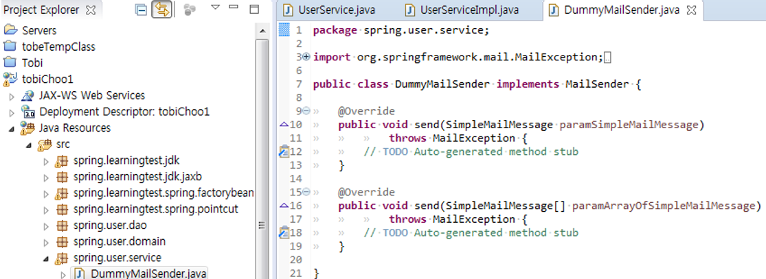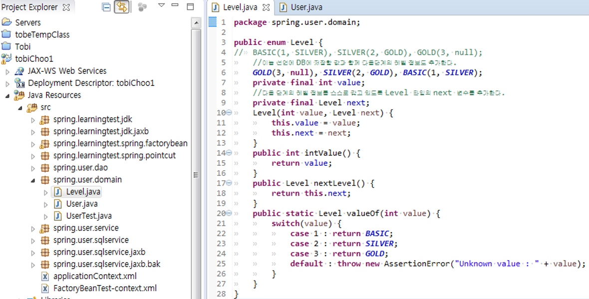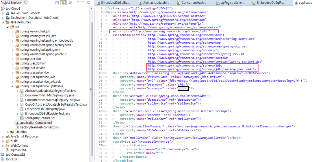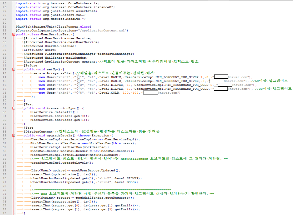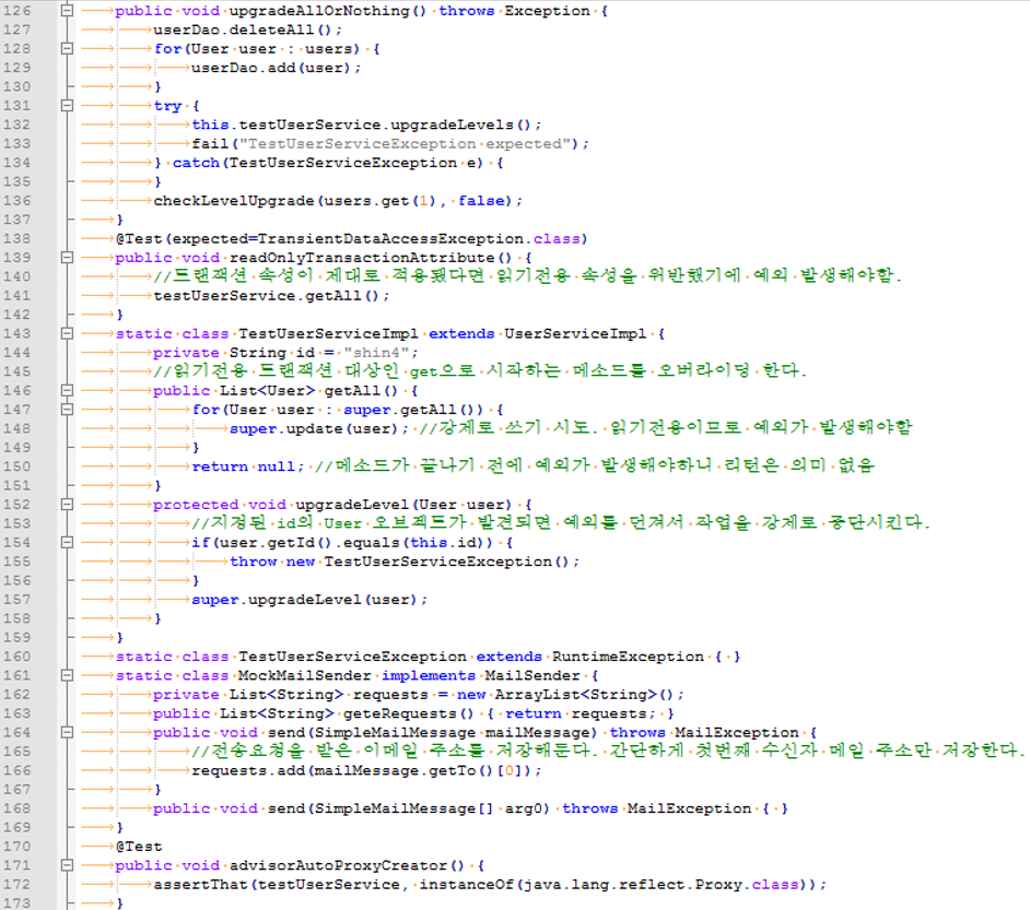 21. 스프링의 JdbcTempate를 통해 JDBC 처리를 하고 있으므로 스프링의 트랜잭션 추상화 서비스를 적용할 수 있다. PlatformTransactionManager를 직접 사용해서 트랜잭션 처리 코드를 만들어도 되지만 그보다는 간결하게 트랜잭션 적용 코드에 템플릿/콜백 패턴을 적용한 TransactionTempate를 쓰는편이 낫다.