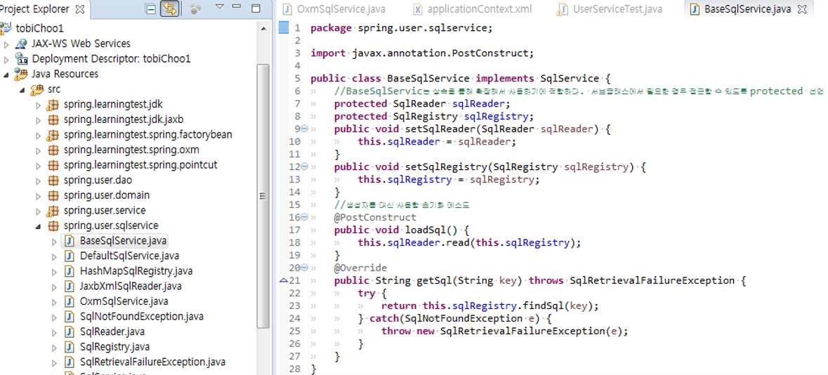 OxmSqlService는 SqlReader를 멤버 클래스로 고정시켜서 OXM에 특화된 형태로 재구성했기 때문에 설정은 간결해지고 의도되지 않은 방식으로 확장될 위험이 없다. 그렇지만 BaseSqlService와 loadSql() getSql() 이라는 핵심 메소드 구현코드가 동일하다는 점이 꺼림직하므로 BaseSqlService 사용.