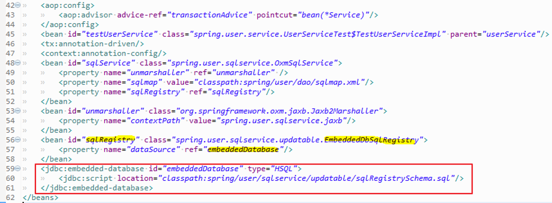 59. jdbc:embedded-database : 이 태그에 의해 만들어지는 EmbeddedDatabase 타입 빈은 스프링 컨테이너가 종료될 때 자동으로 shutdown() 메소드가 호출되도록 설정되어 있다. 내장형 DB를 종료시키기 위한 별도의 코드나 설정은 필요하지 않다.