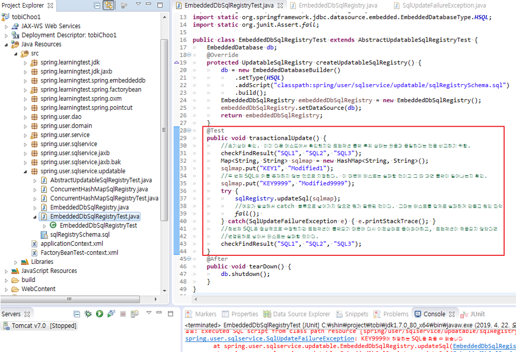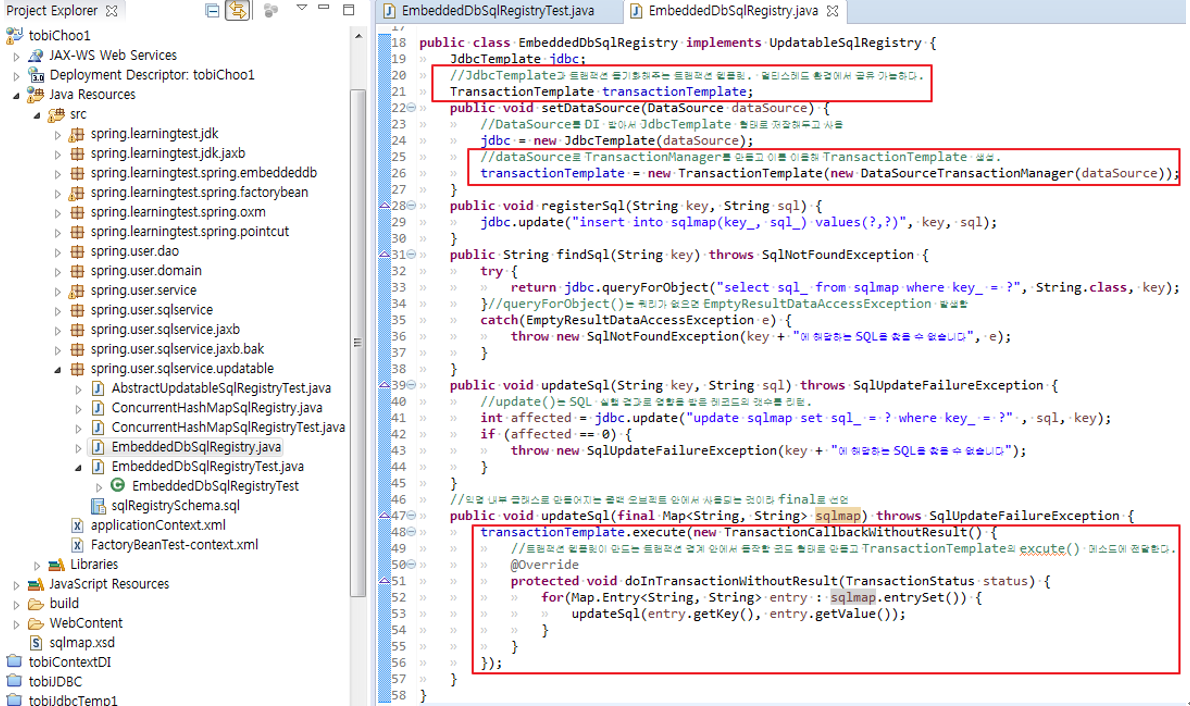 > 가장 먼저 할일은 테스트를 만드는 것이다. 앞에 트랜잭션 편에서 살펴봤지만 트랜잭션의 적용은 수동 테스트로 검증하기는 매우 어렵다. 특별한 예외상황이 아니라면 적용여부가 별 영향을 주지 않기 때문이다. 그러므로 먼저 트랜잭션이 적용되면 성공하고 아니라면 실패하는 테스트를 만들자. 그리고 나서 EmbeddedDbSqlRegistry에 트랜잭션 기능을 추가하면 된다.