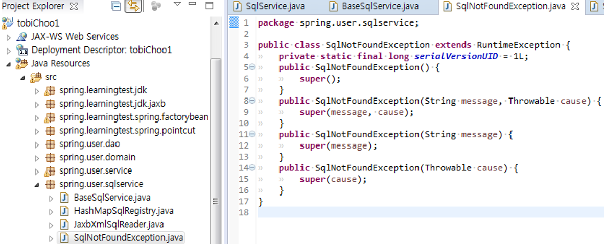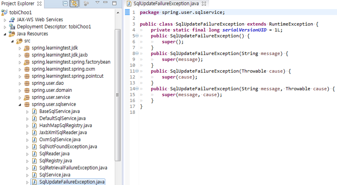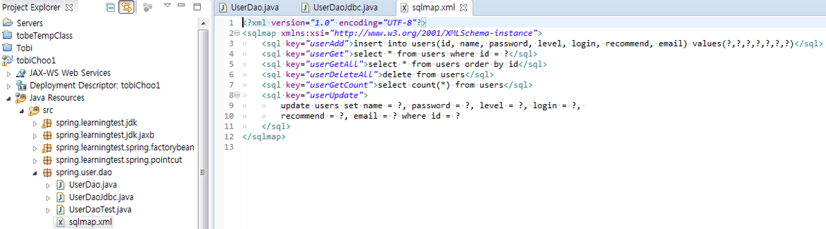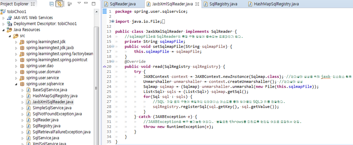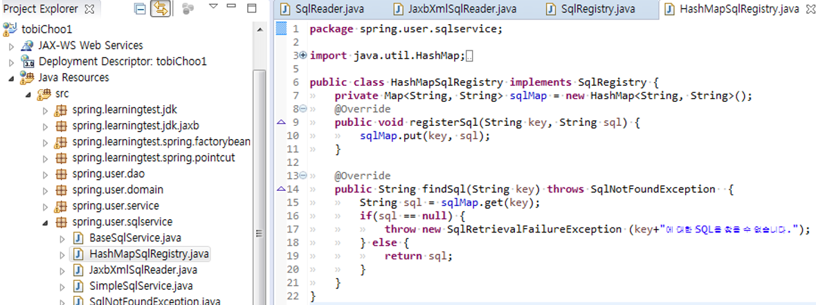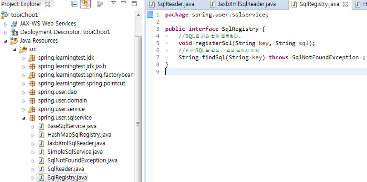 1. SQL 자체 업데이트 기능을 가진 새로운 인터페이스가 생겼다. UpdateableSqlRegistry 하지만 BaseSqlService는 SQL 등록과 조회만을 목적으로 SQL 레지스트리 오브젝트를 사용할 것이므로, 기존의 SqlRegistry 인터페이스를 통해 접근하면 충분하다.