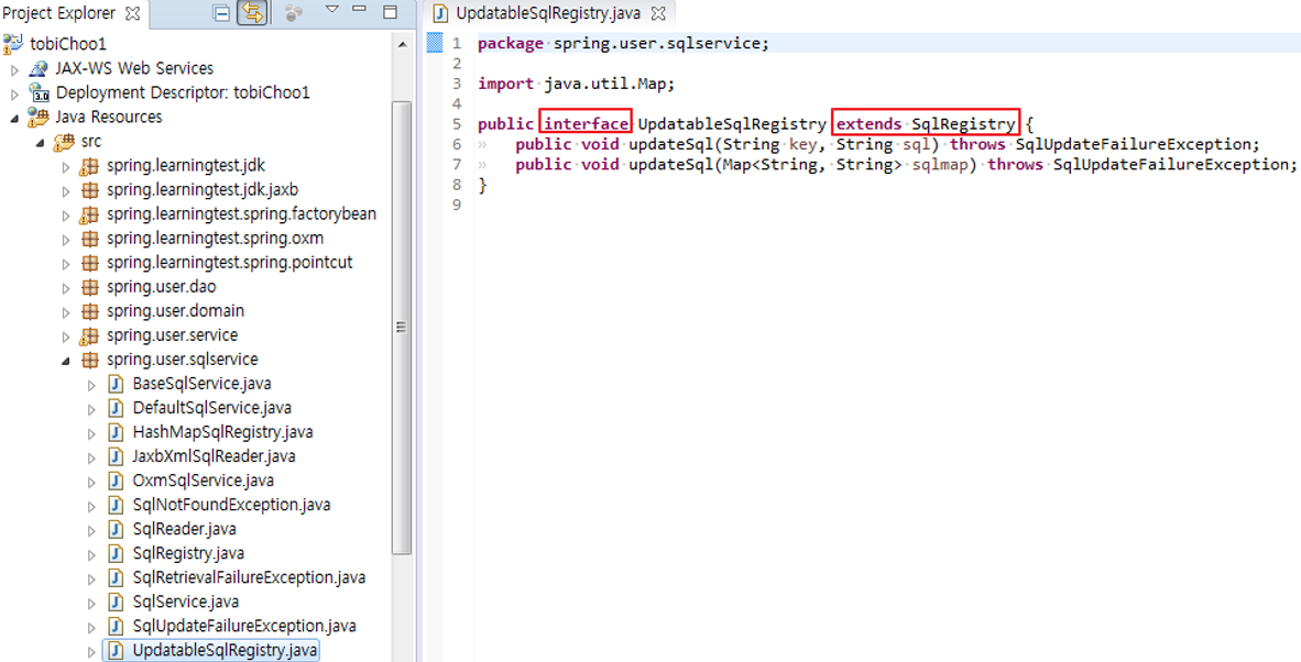 4. SQL 저장소에 담긴 SQL 자체를 변경하는 기능을 추가하기로 했다. 이 때 새로운 클라이언트는 관리자가 사용할 클라이언트일 것이다. 관리기능에는 단순 업데이트 뿐만 아니라 등록이나 조회 같은 기본적인 기능도 필요할 테니 기존 SqlRegistry 인터페이스에 정의된 메소드도 사용할 필요가 있으므로 인터페이스를 상속하여 새로운 인터페이스로 정의. UpdateableSqlRegistry 인터페이스는 SqlRegistry의 서브인터페이스라고 볼 수 있다.
