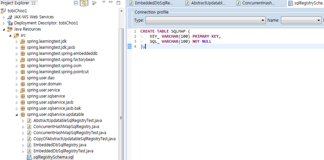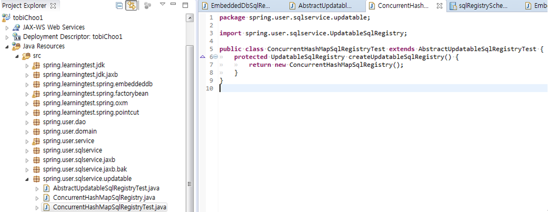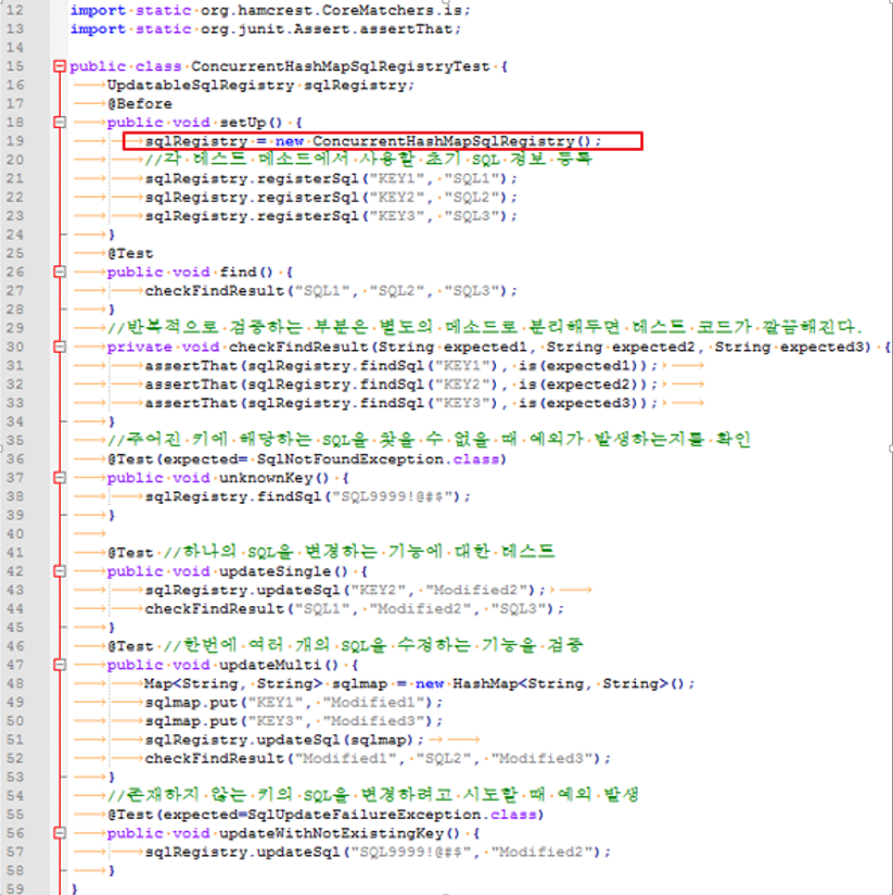 기존(지금은 사용안할거임)의 테스트. ConcurrentHashMapSqlRegistry에 의존하는 부분을 제외하고 나머지 EmbeddedDbSqlRegistry와 테스트는 같다고 볼 수 있다.