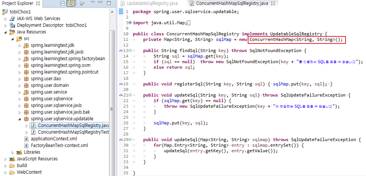 초기화 때 Map에 등록하고 읽기전용으로 동작하는 HashMapSqlRegistry는 동시성 문제가 발생할 일이 없다. 하지만 실시간으로 SQL을 변경해야한다면?