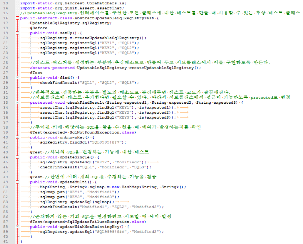 * EmbeddedDbSqlRegistry와 ConcurrentHashMapRegistry 등의 UpdateableSqlRegistry 인터페이스를 구현한 모든 클래스에 대한 테스트하기 위한 추상클래스.