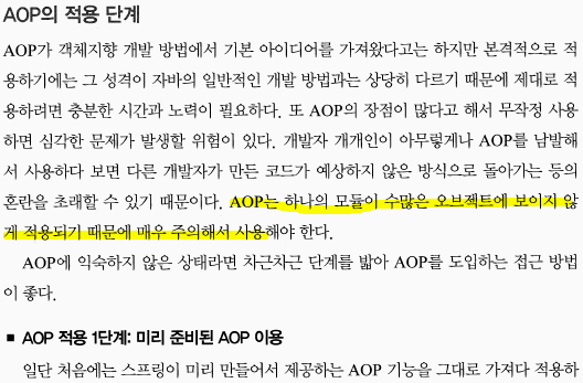 AOP : 객체지향 기술은 매우 성공적인 프로그래밍 방식이지만, 점점 복잡해져 가는 애플리케이션 요구조건과 기술적인 난해함을 모두 해결하는데 한계가 있다. AOP를 사용하면 객체지향 기술의 한계와 단점을 극복하도록 도와주는 보조적인 프로그래밍 기술이다.