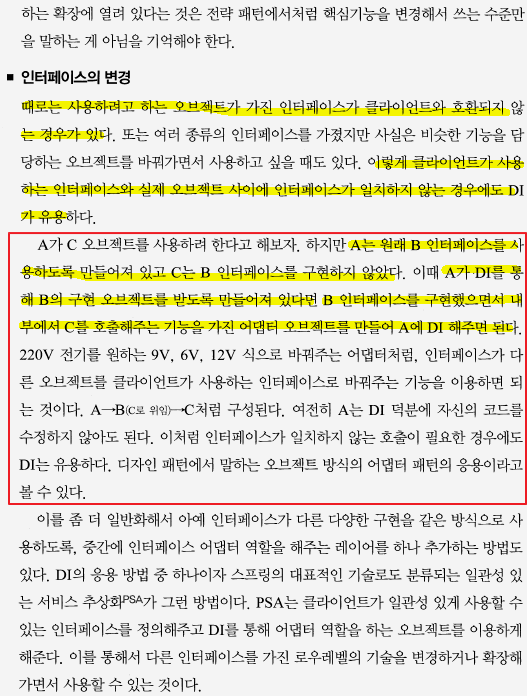 어댑터 패턴 : 클라이언트에서 사용하는 인터페이스(B)가 C오브젝트를 사용할 때 C는 B 인터페이스를 구현하지 않았다. 이 때 B인터페이스를 구현했으면서 내부에서 C를 호출해주는 기능을 가진 어댑터 오브젝트를 만들어 A에 DI 해주는 패턴.