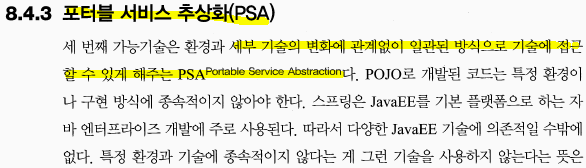 PSA(Portable Service Abstraction) : 환경의 변화와 관계없이 일관된 방식의 기술로의 접근 환경을 제공하려는 추상화 구조(PlatformTransactionManager(JTA), OXM)