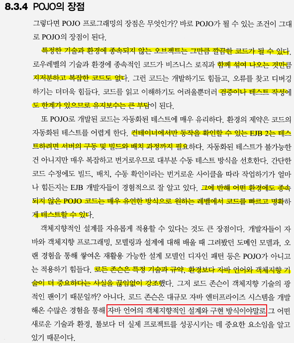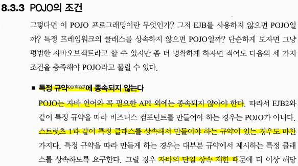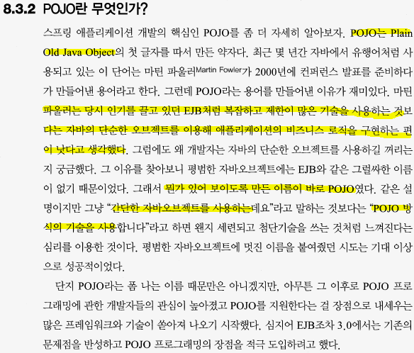 POJO : 객체지향적인 원리에 충실하면서, 환경과 기술에 종속되지 않고 필요에 따라 재활용될 수 있는 방식으로 설계된 오브젝트
