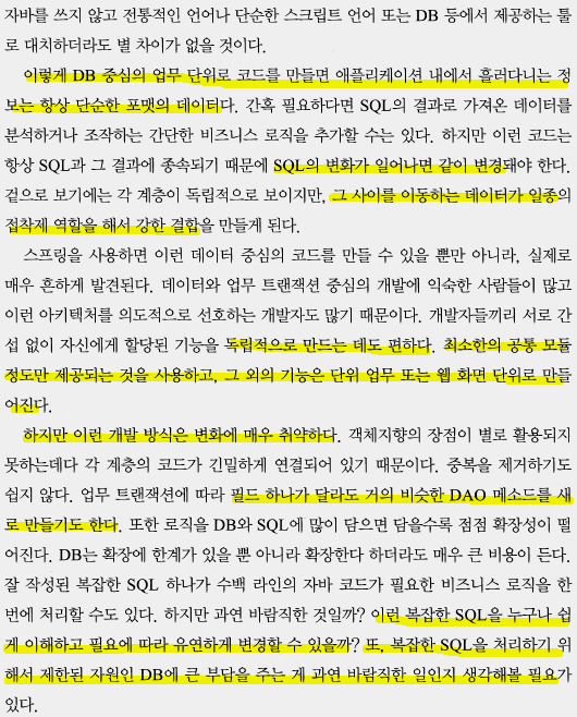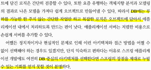 DB(데이터) 중심의 아키텍처를 선택한다면 스프링의 장점을 제대로 누릴 수 있는 기회를 얻지 못한다.