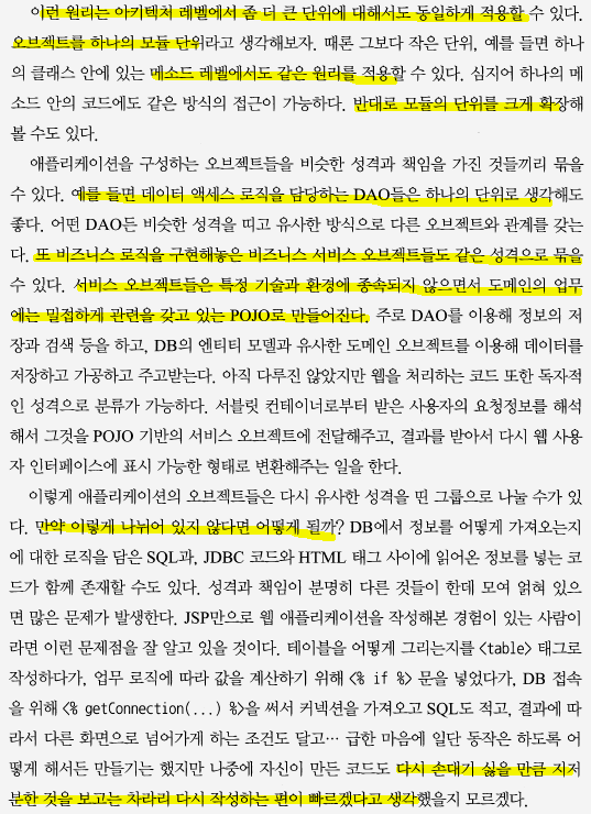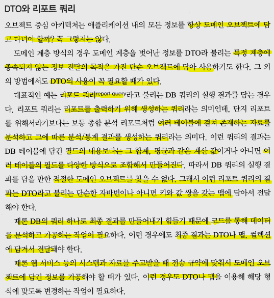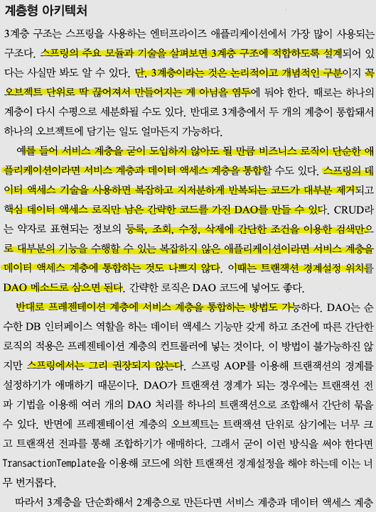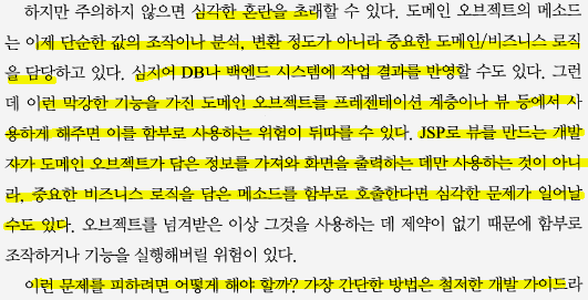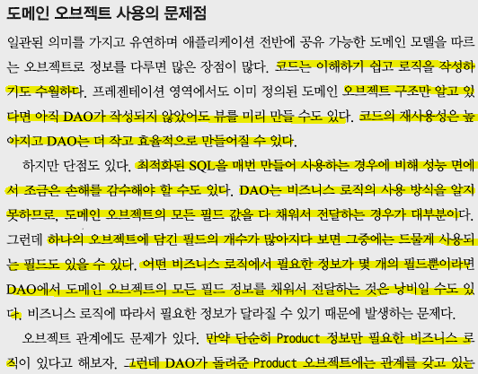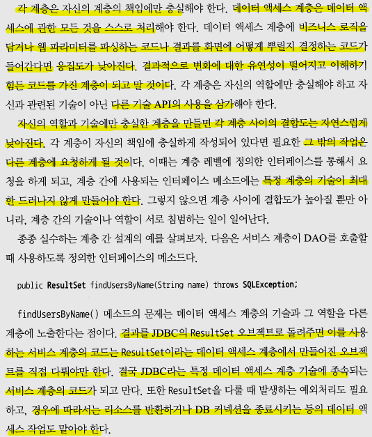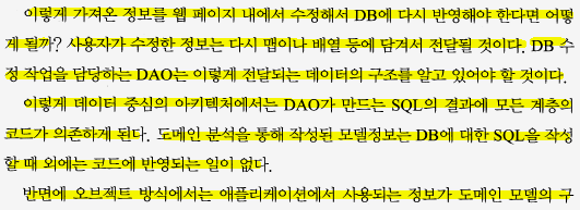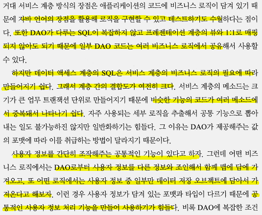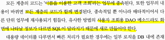 - 만약 DAO에서 SQL을 변경하거나 필드 개수나 순서, 이름을 바꾼다면 서비스, 프레젠테이션 계층의 코드도 같이 변경 돼야 한다.
