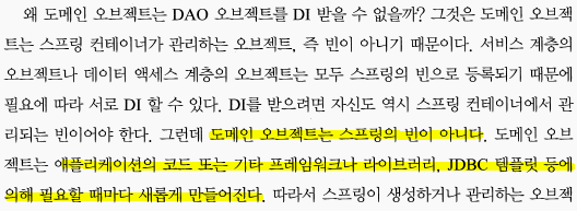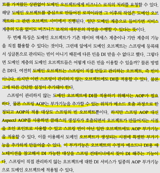 AspectJ AOP를 사용하면 도메인 오브젝트가 생성되는 시점에 오브젝트 수정자 메소드나 DI용 애노테이션을 참고해서 DI 가능한 대상을 스프링 컨테이너에서 찾아 DI 해주는 기능이다.