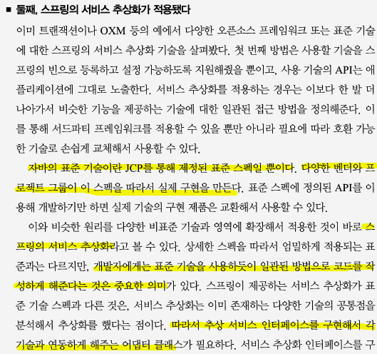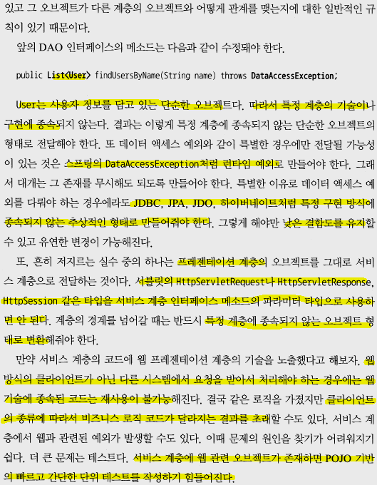 서비스는 API를 직접 다루는 코드가 아니다(JDBC API등을 다룬 DAO를 호출하는 코드임). API를 호출하는 형태로 순수 비즈니스 로직만 담아야 한다.(어떤 구현에 종속되어서는 안된다.)