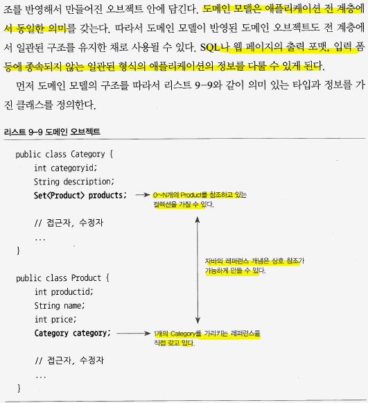 - DB의 Category 테이블에는 Product 테이블과 어떻게 연결되는지에 대한 정보가 없다. 하지만 자바에서는 레퍼런스 변수를 통한 상호 참조가 가능하기 때문에 원한다면 Category 오브젝트에서 다음과 같은 코드로 Category에 속한 Product를 간단히 가져올 수도 있다. Set<Product> products = myCategory.getProducts();)