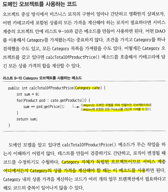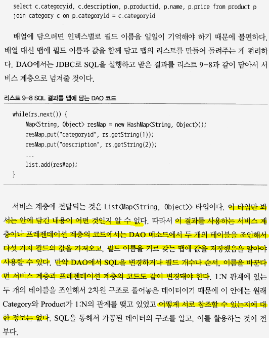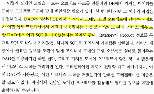 - Category와 Product 정보를 두개의 SQL에서 나눠 가져왔든, 하나의 SQL로 조인해서 가져왔든 상관없다. 서비스 계층에서 필요한 정보를 조건에 맞게 조회해서 도메인 모델 오브젝트 형태로 돌려주는 DAO를 이용하기만 하면 된다. 프레젠테이션 계층역시 어떤 비즈니스인지, 어떤 DAO인지 알필요없이 도메인 오브젝트를 활용해서 필요한 정보를 화면에 출력하기만 하면 된다.