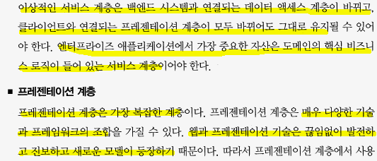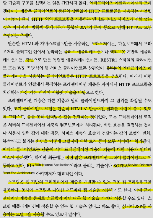 * 프레젠테이션 계층 : 브라우저상의 웹 클라이언트의 요청 및 응답을 처리