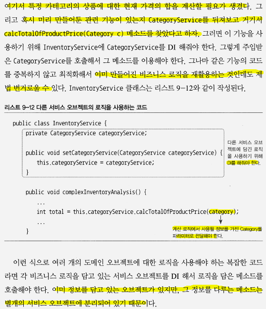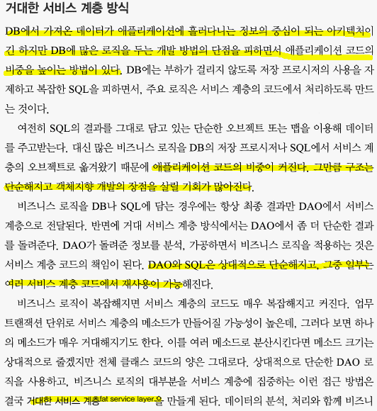 > 비즈니스 로직이 복잡해지면 서비스 계층의 코드도 매우 복잡해지고 커진다. 거대한 서비스 계층(fat service layer)을 만들게됨.
