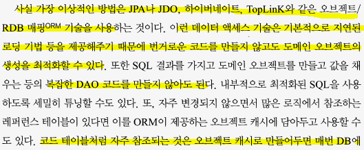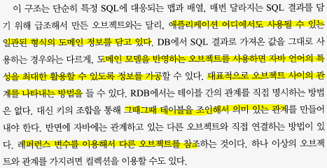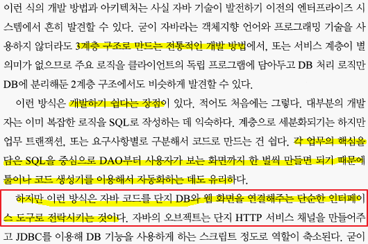 > DAO와 SQL은 상대적으로 단순해지고, 애플리케이션 코드의 비중이 커지는 만큼, 구조는 단순해지고 객체지향 개발의 장점을 살릴 기회가 많아진다.
