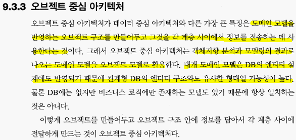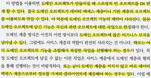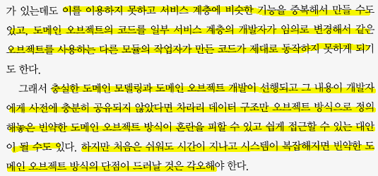 > 대개 도메인 모델은 DB의 엔티티 구조와 유사한 형태일 가능성이 높다. 비즈니스 로직에만 존재하는 모델도 있기 때문에 항상 일치하는 것은 아니다.