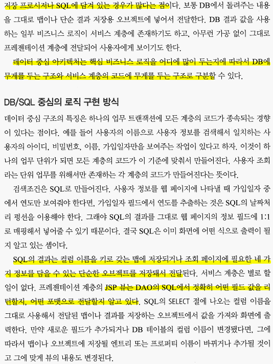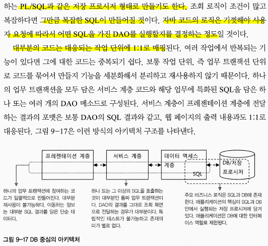 DB/SQL 중심의 로직 구현 : 보통 사용하는 것. 모든 계층의 코드가 조회라는 업무에 종속됨. 내가 보통 사용하던 방식. SQL이 번잡해지고 각 계층은 DB와 클라이언트를 연결해주는 단순 인터페이스로 전락한다.