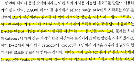 > Product 정보를 가져올 때 Category가 필요한 경우와 그렇지 않은 경우를 구분해서 DAO를 만들어 줄 수 있지만, 그렇게 되면 데이터 중심 아키텍처의 단점인 DAO와 비즈니스 로직 코드의 결합도가 높아지는 문제가 발생할 수도 있다.