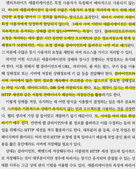 * 엔터프라이즈 애플리케이션 : 서버에서 동작하며 기업과 조직의 업무를 처리해주는 시스템. 많은 사용자의 요청을 동시에 처리해야 하기 때문에 서버의 자원을 효율적으로 공유하고 분배해서 사용할 수 있어야한다.