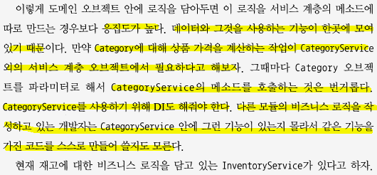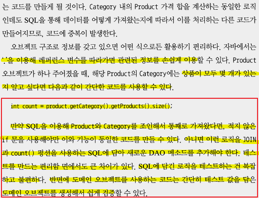 - Category와 Product 정보를 두개의 SQL에서 나눠 가져왔든, 하나의 SQL로 조인해서 가져왔든 상관없다. 서비스 계층에서 필요한 정보를 조건에 맞게 조회해서 도메인 모델 오브젝트 형태로 돌려주는 DAO를 이용하기만 하면 된다. 프레젠테이션 계층역시 어떤 비즈니스인지, 어떤 DAO인지 알필요없이 도메인 오브젝트를 활용해서 필요한 정보를 화면에 출력하기만 하면 된다.