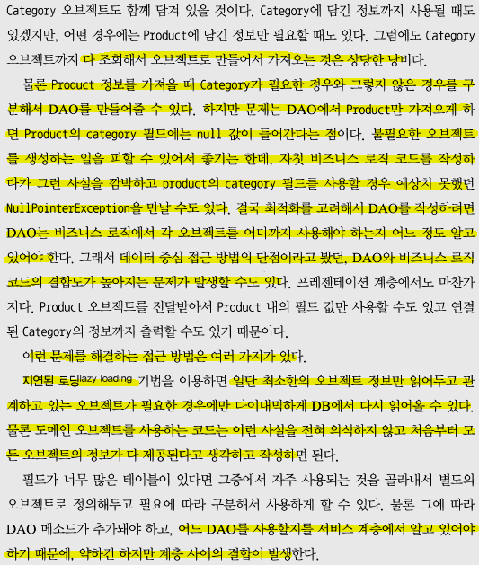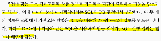 > Product 정보를 가져올 때 Category가 필요한 경우와 그렇지 않은 경우를 구분해서 DAO를 만들어 줄 수 있지만, 그렇게 되면 데이터 중심 아키텍처의 단점인 DAO와 비즈니스 로직 코드의 결합도가 높아지는 문제가 발생할 수도 있다.