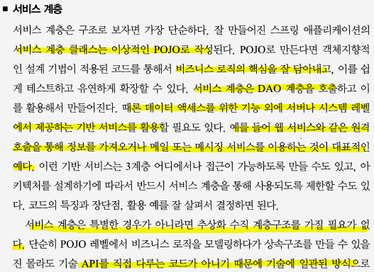 서비스는 API를 직접 다루는 코드가 아니다(JDBC API등을 다룬 DAO를 호출하는 코드임). API를 호출하는 형태로 순수 비즈니스 로직만 담아야 한다.(어떤 구현에 종속되어서는 안된다.)