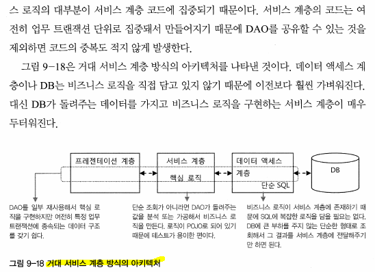 > 비즈니스 로직이 복잡해지면 서비스 계층의 코드도 매우 복잡해지고 커진다. 거대한 서비스 계층(fat service layer)을 만들게됨.