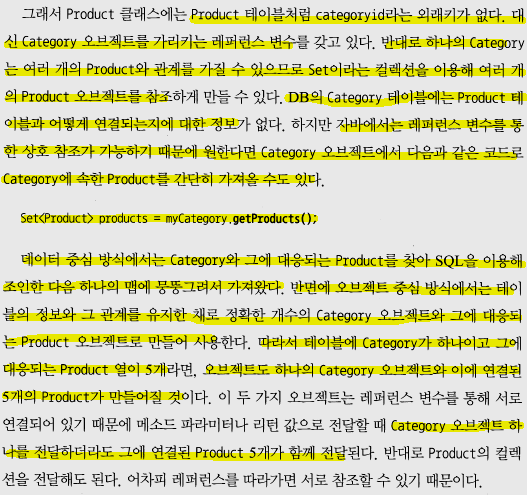 - DB의 Category 테이블에는 Product 테이블과 어떻게 연결되는지에 대한 정보가 없다. 하지만 자바에서는 레퍼런스 변수를 통한 상호 참조가 가능하기 때문에 원한다면 Category 오브젝트에서 다음과 같은 코드로 Category에 속한 Product를 간단히 가져올 수도 있다. Set<Product> products = myCategory.getProducts();)