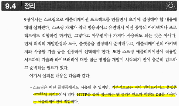* 엔터프라이즈 애플리케이션 : 서버에서 동작하며 기업과 조직의 업무를 처리해주는 시스템. 많은 사용자의 요청을 동시에 처리해야 하기 때문에 서버의 자원을 효율적으로 공유하고 분배해서 사용할 수 있어야한다. HTTP를 통해 접근하는 웹클라이언트와 백엔드 DB를 사용하는 애플리케이션에 적합함.