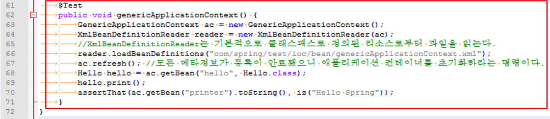 - GenericXmlApplicationContext는 XmlBeanDefinitionReader를 내장하고 있기 때문에, XML 파일을 읽어들이고 refesh()를 통해 초기화 하는 것까지 한 줄로 끝낼 수 있다.