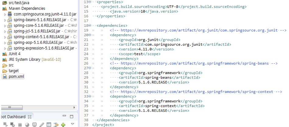 7. Com.springsource.junit : junit > Java10 문제인지 Maven문제인지 잘 인식이 안되서 시스템 라이브러리르 등록함. 호환되는 junit5버전이 있지만 설명이 많이 없어서 걍 4씀