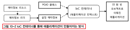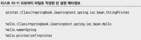 - 스프링의 메타정보는 특정한 파일 포맷이나 형식에 제한되거나 종속되지 않는다. XML이든 소스코드 애노테이션이든 자바 코드이든 프로퍼티 파일이든 상관없이 BeanDefinition으로 정의되는 스프링의 설정 메타정보의 내용을 표현한 것이 있다면 무엇이든 사용 가능하다.
