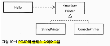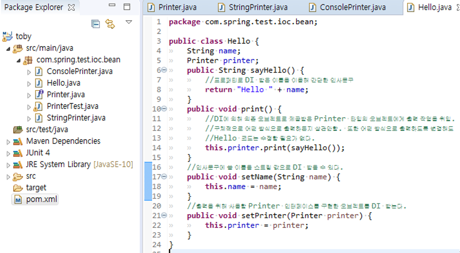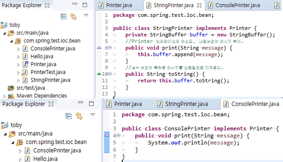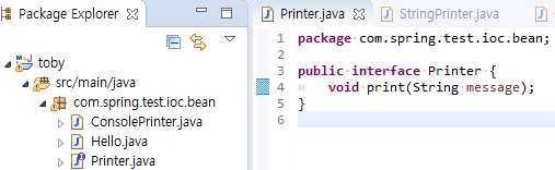 Printer를 구현한 각자 기능에 충실하게 독립적으로 설계된 POJO 클래스(구현체)를 만들고, 결합도가 낮은 유연한 관계를 가질 수 있도록 인터페이스를 이용해 연결해주는 것이 IOC컨테이너가 사용할 POJO를 준비하는 첫 단계 이다.
