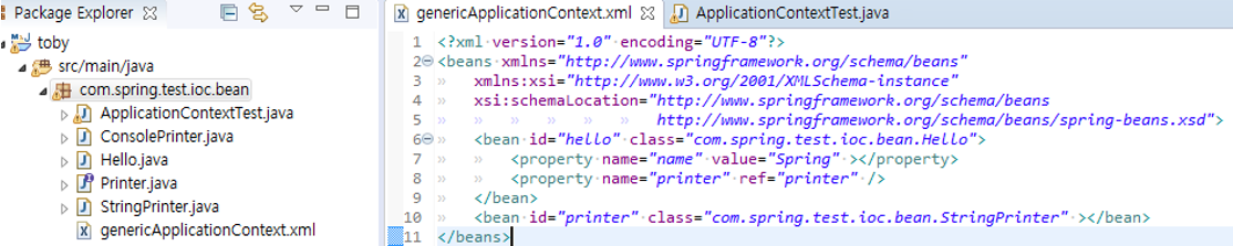 - GenericApplicationContext를 사용하는 경우 번거롭게 XmlBeanDefinitionReader를 직접 만들지 말고, 이 두 개의 클래스가 결합된 GenericXmlApplicationContext를 사용하면 편리하다.