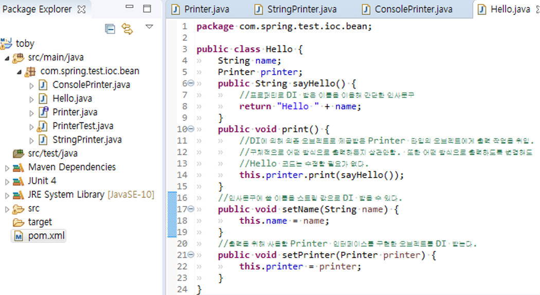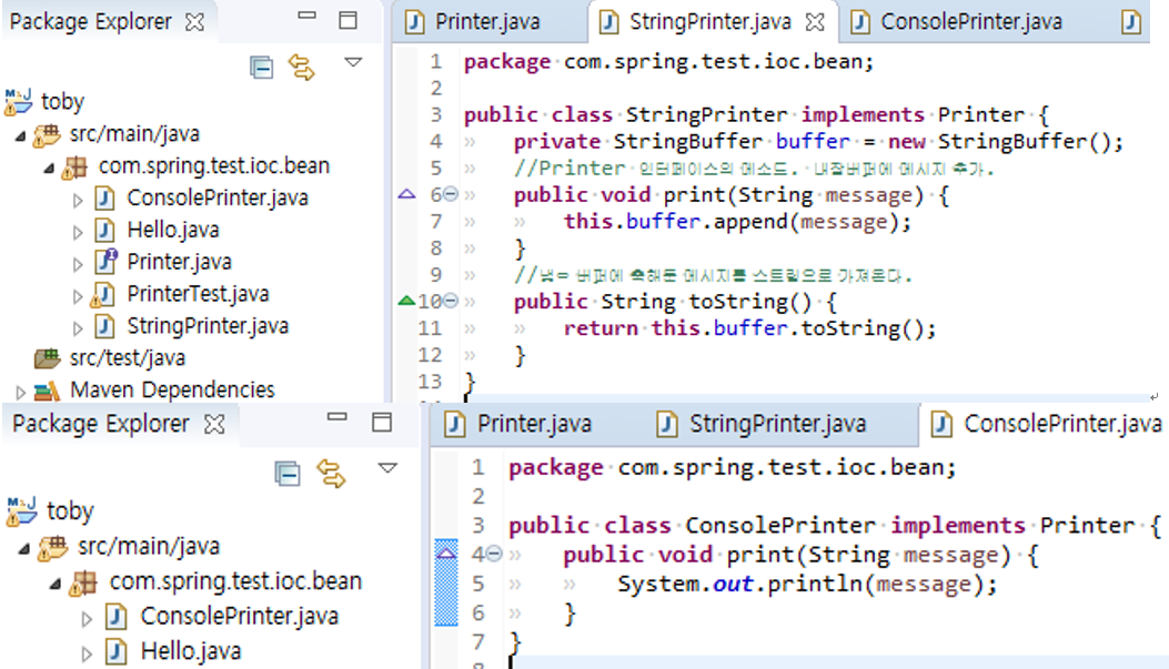 Printer를 구현한 각자 기능에 충실하게 독립적으로 설계된 POJO 클래스(구현체)를 만들고, 결합도가 낮은 유연한 관계를 가질 수 있도록 인터페이스를 이용해 연결해주는 것이 IOC컨테이너가 사용할 POJO를 준비하는 첫 단계 이다.