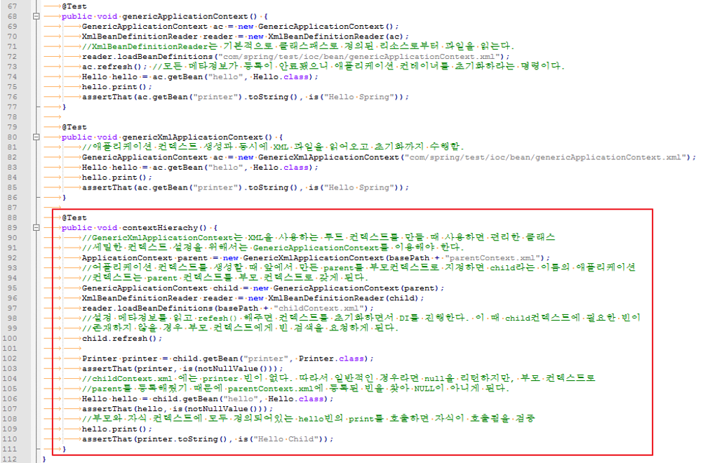 100. refresh() : 리더를 사용해서 읽은 경우에는 반드시 호출해야함. GenericXmlApplication Context은 리더를 구현하지 않으므로 생략 가능. 설정 메타정보를 읽고 refresh() 해주면 컨텍스트를 초기화하면서 DI를 진행한다. 이 때 child 컨텍스트에서 필요한 빈이 존재하지 않을 경우 부모 컨텍스트에게 빈 검색을 요청하게 된다.