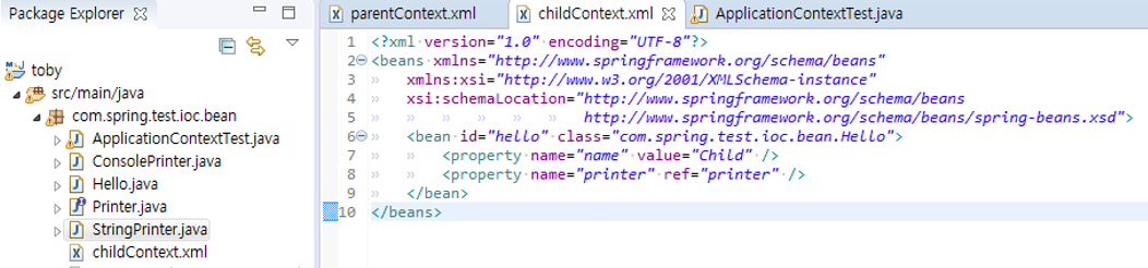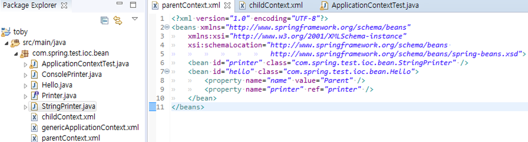 8. ref=”printer” 참조하고 있지만 해당 빈이 없다. 하지만 parentContext.xml을 부모 컨텍스트로 이용할 것이다.