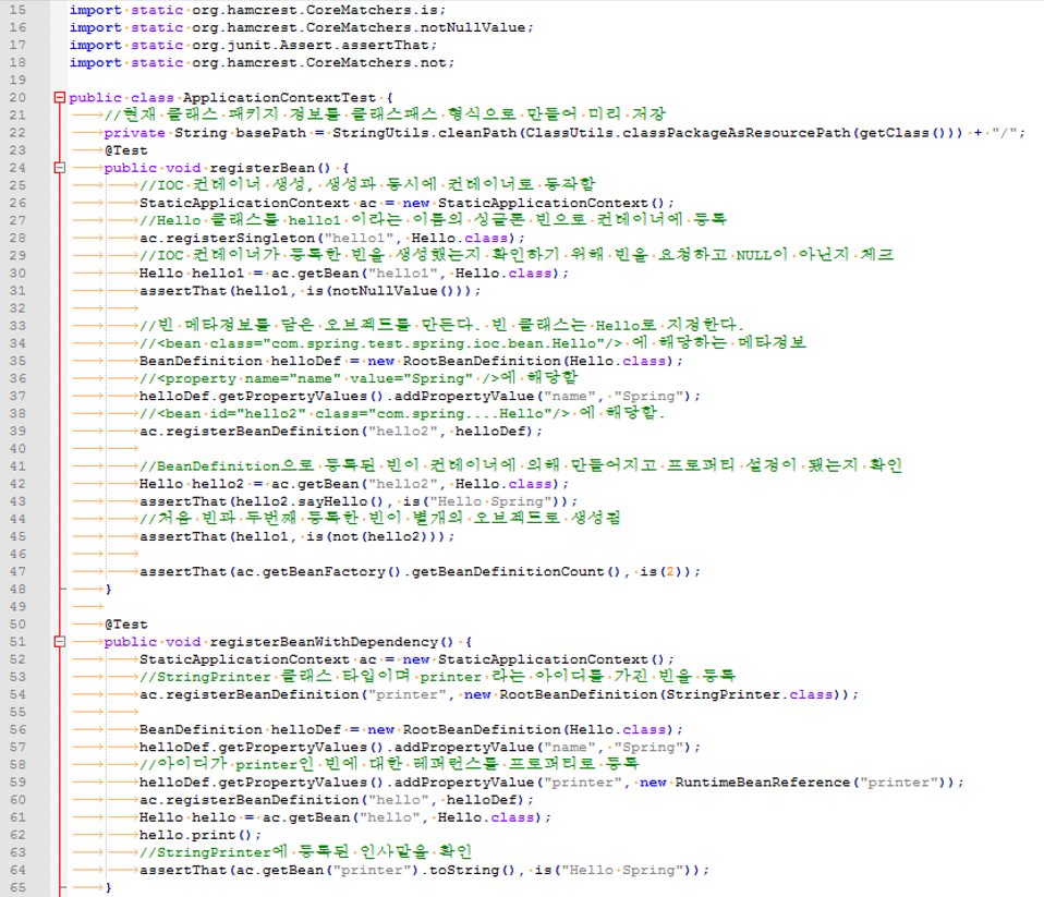 20. StaticApplicationContext의 디폴트 메타정보를 사용해서 싱글톤 빈을 등록해주는 registerSingleton() 메소드 사용.