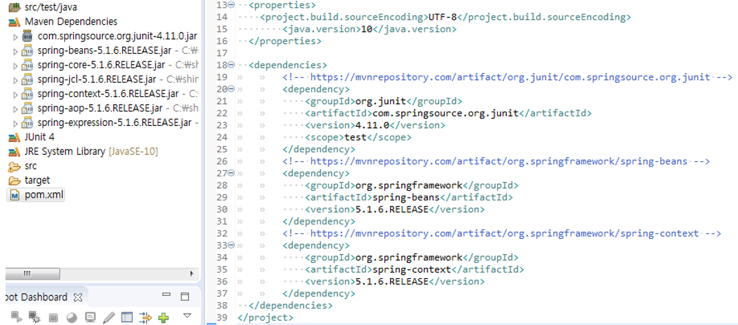 7. Com.springsource.junit : junit > Java10 문제인지 Maven문제인지 잘 인식이 안되서 시스템 라이브러리르 등록함. 호환되는 junit5버전이 있지만 설명이 많이 없어서 걍 4씀