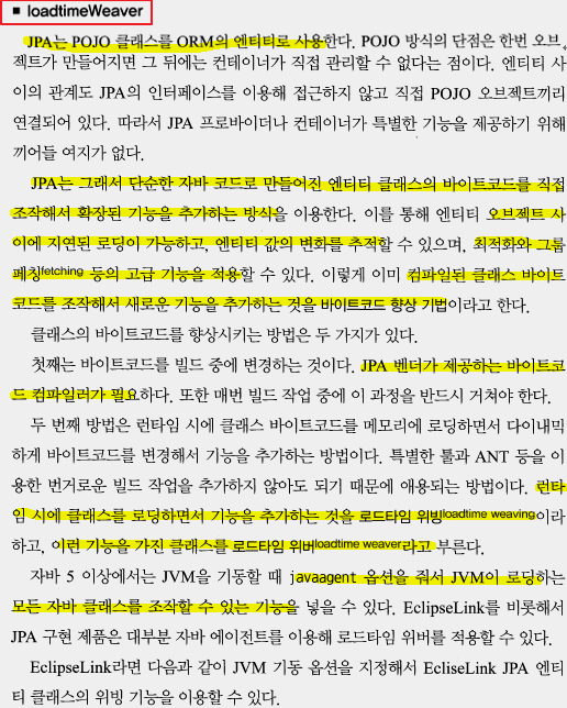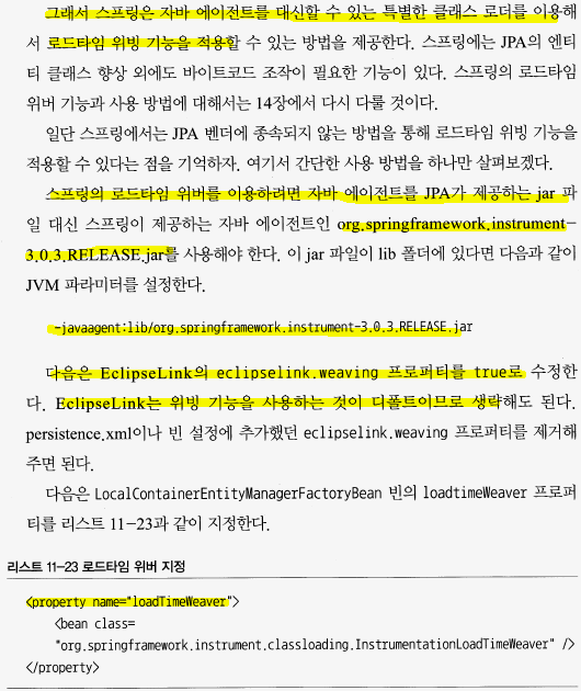 > 이 방식은 JPA만을 사용하는 단순한 환경에 적용한다. 가장 큰 단점은 스프링의 빈으로 등록한 DataSource를 사용할 수 없으며, 스프링이 제공하는 바이트코드 위빙 기법도 적용할 수 없다.