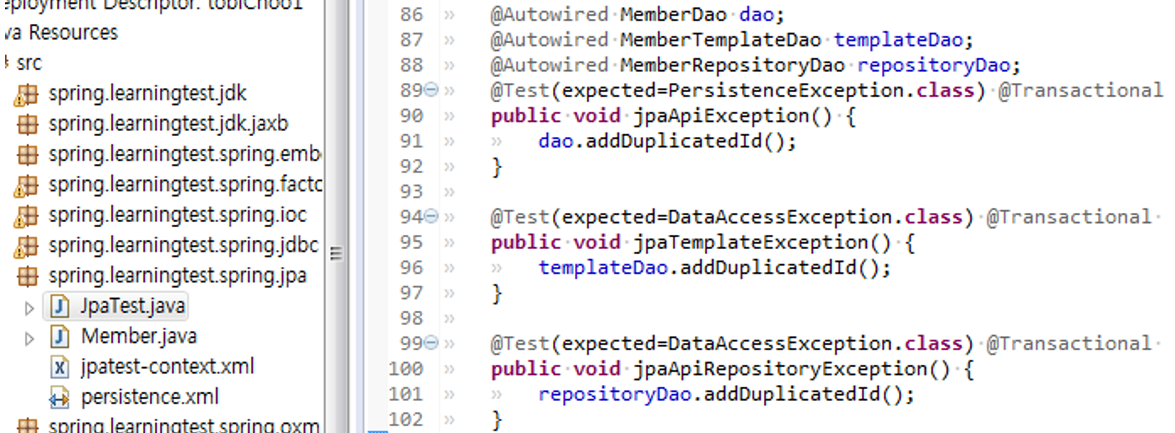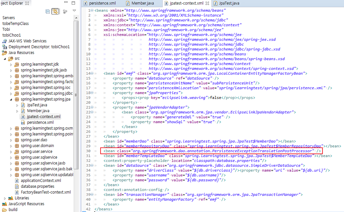 > JpaTemplate를 사용하지 않고 JPA API를 직접 이용하는 경우에도 JPA 예외를 스프링의 DataAccessException 예외로 전환시킬 수는 있다. 스프링의 AOP를 이용하면 된다.