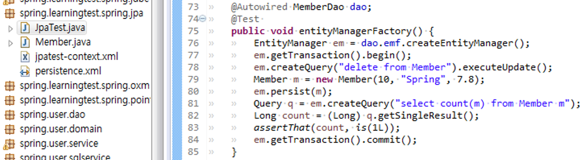 * 위와 같은 방법은 실제로는 자주 쓰지 않는다. 매번 코드에 의해 EntityManager가 생성되고 트랜잭션도 코드에 의해 관리되므로 매우 번거롭다.