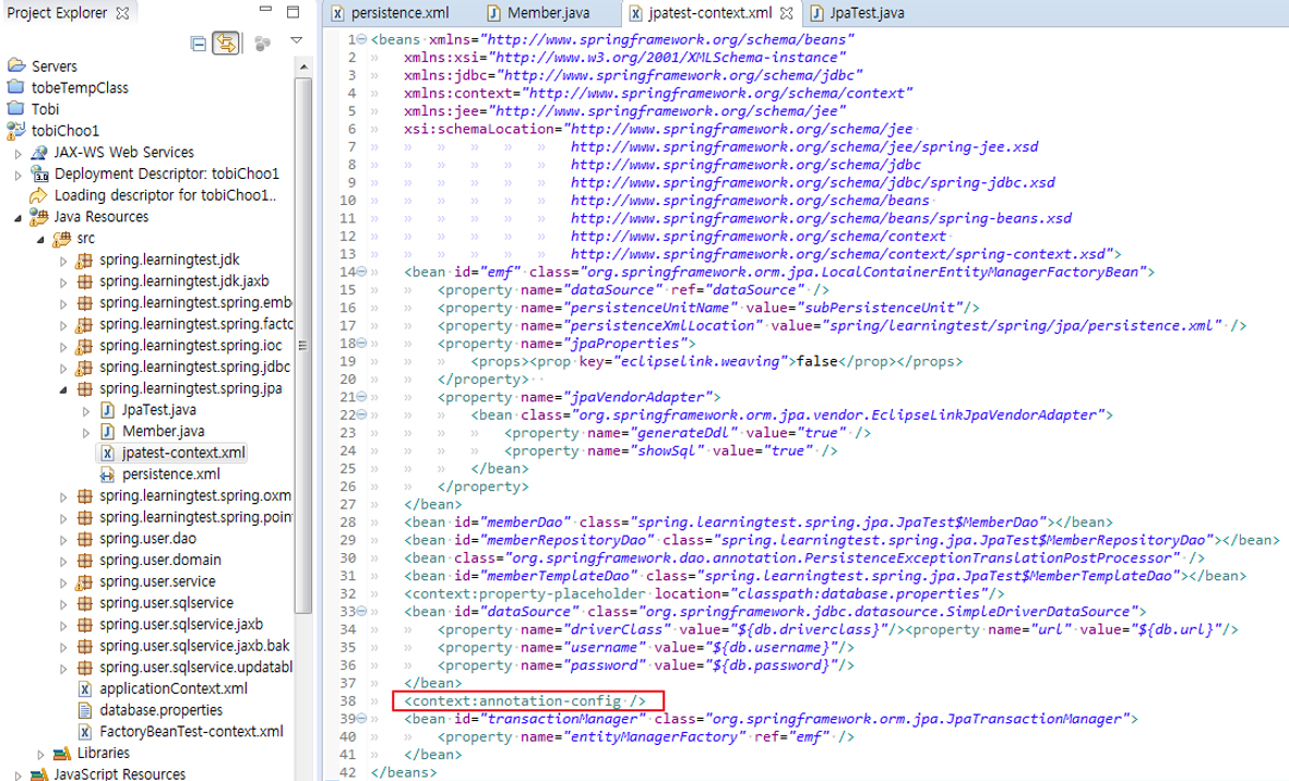 38. context:annotation-config에 의해 자동등록되는 PersistenceAnnotationBeanPostProcessor 후처리기가 @PersistenceUnit 애노테이션에 대한 DI 작업을 담당한다.
