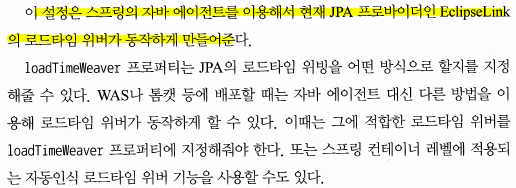 18) jpaProperties, jpaPropertyMap : EntityManagerFactory를 위한 프로퍼티 지정시 사용. jpaPropertiessms <props>를 사용하고, jpaPropertyMap은 <map>을 이용해 프로퍼티 정보를 넣을 수 있다. 이 프로퍼티 정보는 persistence.xml의 <properties> 태그로 정의한 프로퍼티와 함께 EntityManagerFactory를 생성할 때 사용된다. 위에서는 바이트코드 위빙을 사용하지 않겠다고 지정함.