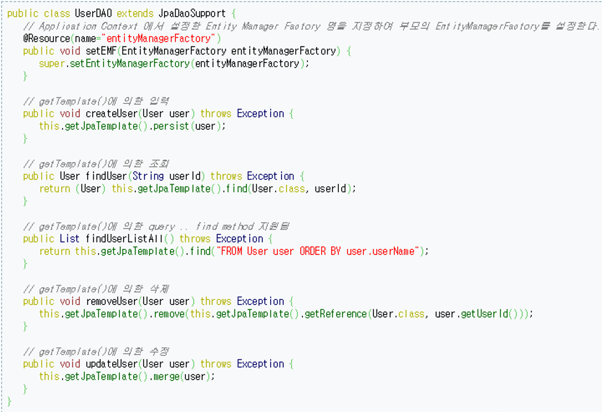 * JpaDaoSupport 클래스를 상속해서 DAO를 만들면 JpaTemplate를 생성하는 코드는 생략할 수 있다. jpaTemplate가 필요한 경우 getJapTemplate() 메소드를 이용하면 된다.