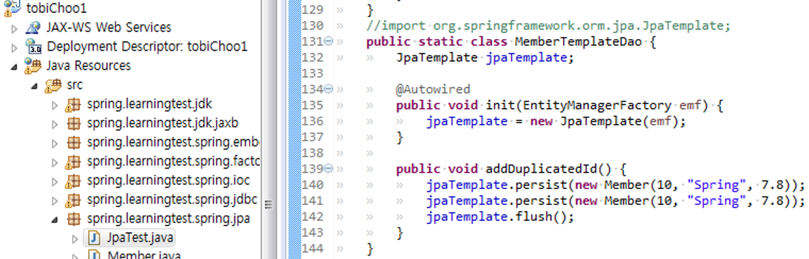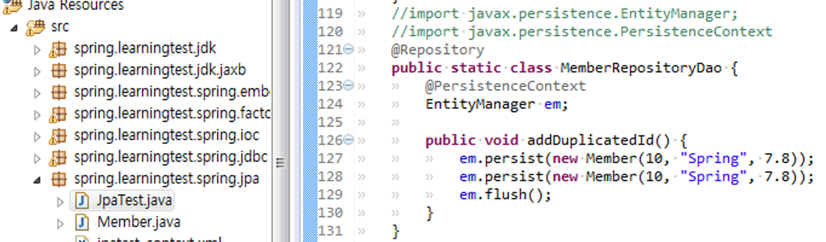 127~128. Persist : 기본키를 동일하게 인서트 시키면 스프링에서 정의한 Exception이 나겠지만 @PersistenceContext를 이용한 JPA API를 사용했기 때문에 스프링에러가 안나지만 스프링 AOP를 적용했으므로 Spring 에러가 난다.