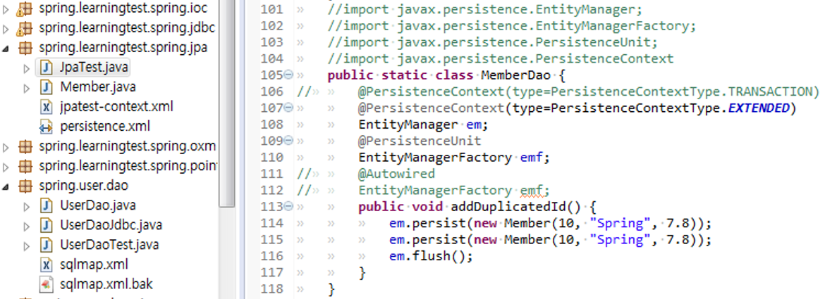 111. Autowired나 Resource 또는 일반적인 스프링의 DI 방식으로 DAO로 가져와 사용가능. 이것도 PersistenceUnit과 마찬가지로 스프링의 의존도가 전혀 없는 순수한 JPA코드